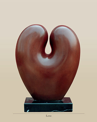 De titel van 'Love' geeft ondubbelzinnig weer wat dit beeld uit wil drukken: liefde. Het koesteren van liefde voor iemand is voor mij de wens om ��n te willen worden met de ander. Je wilt samensmelten met degene waar je van houdt. Liefde kan daarom pas ontstaan wanneer er sprake is van twee: jij en de ander. De ruimte tussen twee mensen is een noodzakelijke voorwaarde voor liefde. Het beeld drukt een prille vorm van liefde uit, het bestaat voor het grootste gedeelte immers nog uit ��n geheel. Hieruit ontstaan twee afzonderlijke vormen met daartussen een druppelvormige ruimte. De eenheid gaat uit elkaar in twee delen, die vervolgens weer naar elkaar toe neigen, ze willen weer ��n zijn. De ene zijde van het beeld is rond, de andere zijde van het beeld is plat en hoekig. De ronde afbeelding staat voor de gevoelsmatige kant van liefhebben, of beter gezegd, het liefhebben vanuit het gevoel. De platte kant staat voor het liefhebben vanuit het hoofd, de meer rationele liefde. Daarmee bedoel ik het gegeven dat je ook van rationele verschijnselen zoals tekst of wiskunde kunt houden. Liefde met het hart en liefde met het hoofd worden daarmee in dit beeld verenigd.